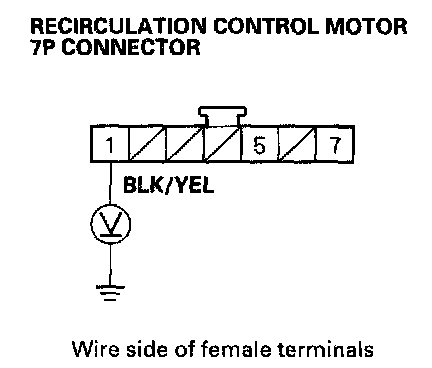 4. Measure the voltage between the No.1 terminal of the recirculation control motor 7P connector and body ground.