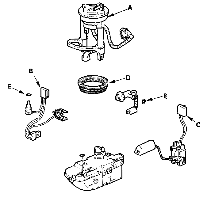 - When installing the fuel gauge sending unit (C), make sure the connection is secure and the connector is firmly locked into place. Be careful not to bend or twist it excessively.