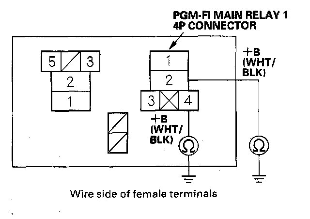 18. Check for continuity between body ground and PGM-FI main relay 1 4P connector terminals No. 2 and No. 4 individually.