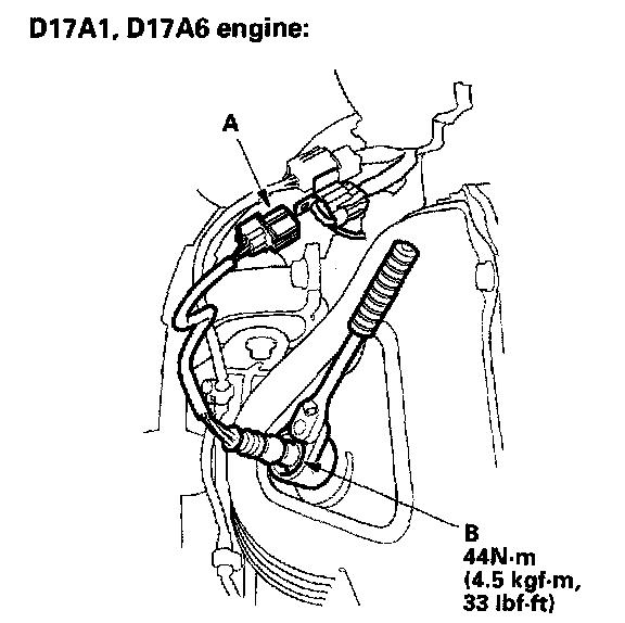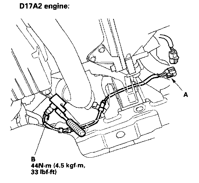 1. Disconnect the primary HO2S or A/F sensor 4P connector (A), then remove the primary HO2S or A/F sensor (B).