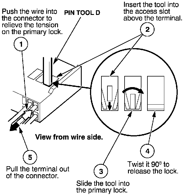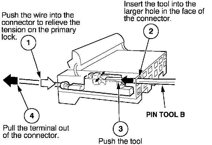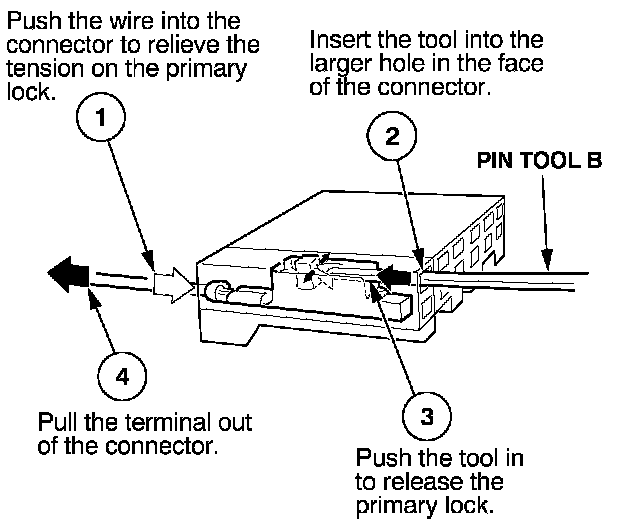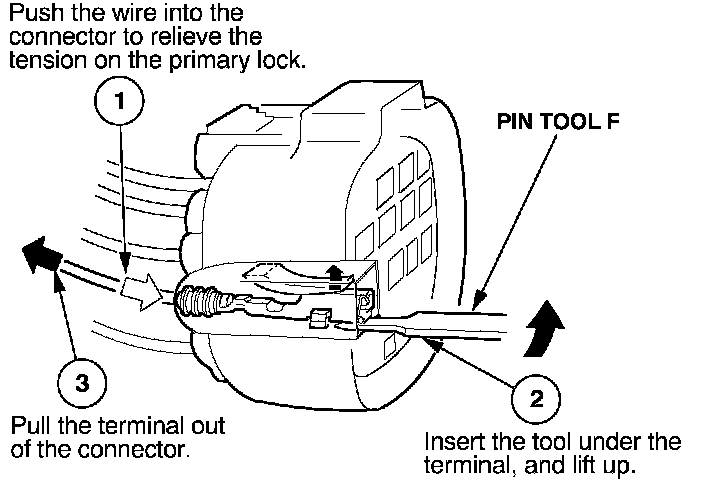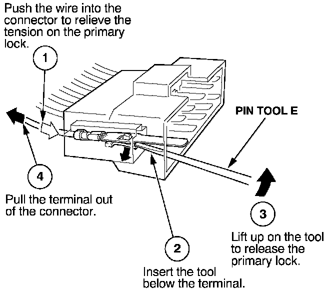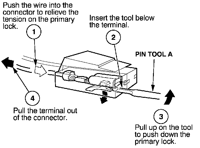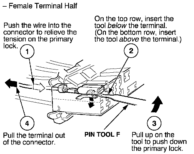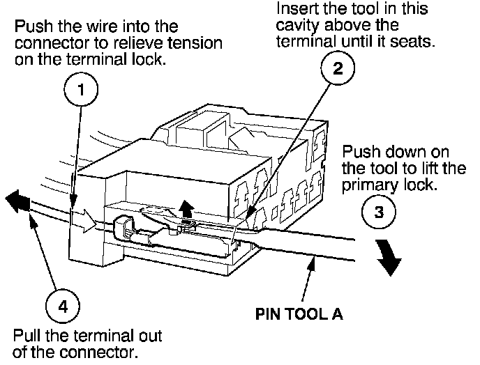 Before you begin, inspect the wire you are about to repair for damage and length. Make sure the wire will be long enough to make a terminal repair without stretching it when you reinstall the terminal in the connector. If the wire is too short, or if access to the connector is too restricted to make a terminal repair, you may need to install a pigtail terminal (a short length of wire with a factory-crimped terminal on it). Refer to HOW TO INSTALL PIGTAIL TERMINALS.