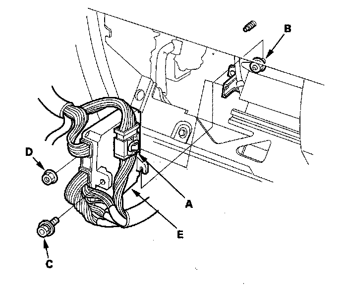 3. Loosen the mounting nut (B) on the lower right of the PCM, and remove the mounting bolt (C) and nut (D) on the left of the PCM.
