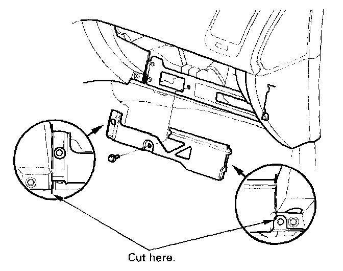 2. Remove the bolt. Cut the plastic cross brace in the glove box opening with diagonal cutters in the area shown, and discard it.