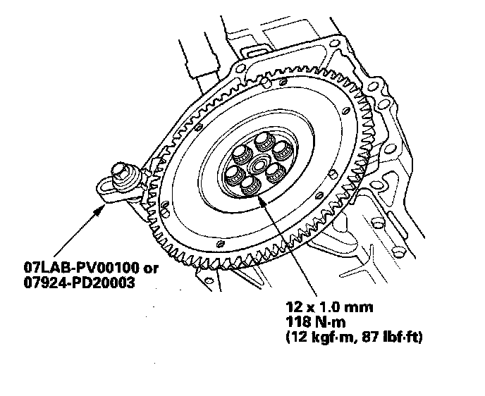 Flywheel mounting bolts in a crisscross pattern in several steps.
