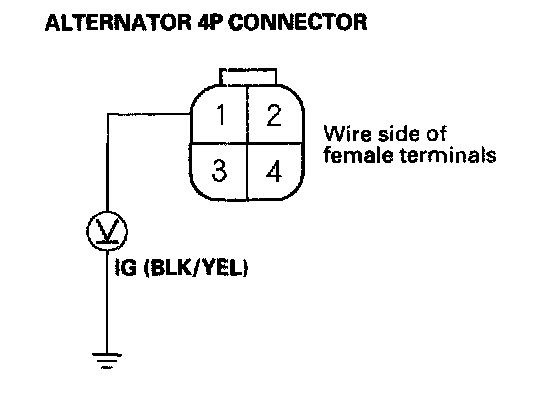 7. Measure the voltage between alternator 4P connector terminal No. 1 and body ground.