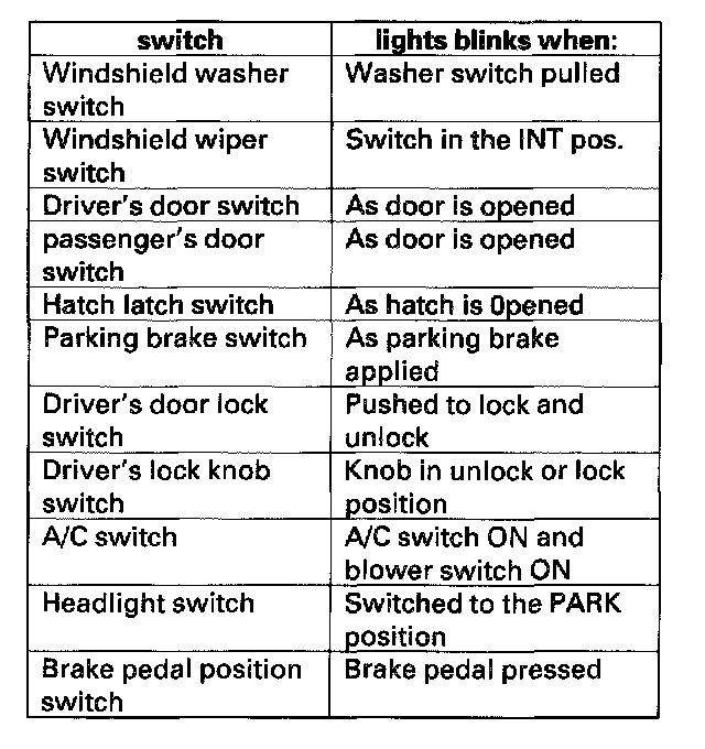 3. Operate the switches listed below: If the circuit is OK, the spotlight and ceiling light will blink once. If the circuit is faulty, the lights will not blink.