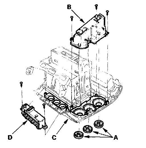 2. Remove the dials (A), then remove the self tapping screws and the heater control panel (B) from the center panel (C) Remove the self tapping screws and the push switch assembly (D) from the center panel