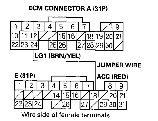 2. Momentarily connect ECM connector terminals A24 and E18 with a jumper wire several times.