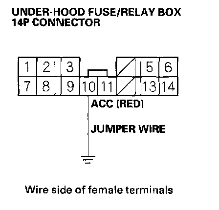 6. Momentarily connect under-hood fuse/relay box 14P connector terminal No.10 to body ground with a jumper wire several times.
