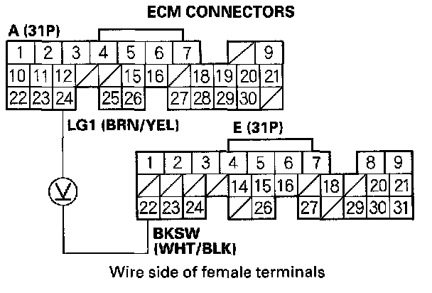 3. Measure voltage between ECM connector terminals A24 and E22 with the brake pedal pressed.