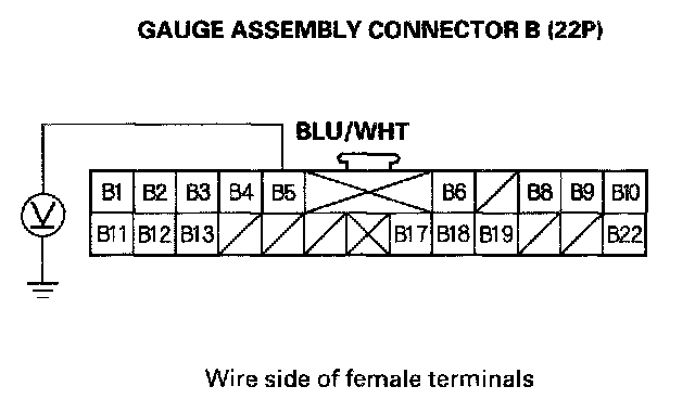 17. Connect the positive probe of a voltmeter to the BLU/WHT wire and the negative probe to ground.