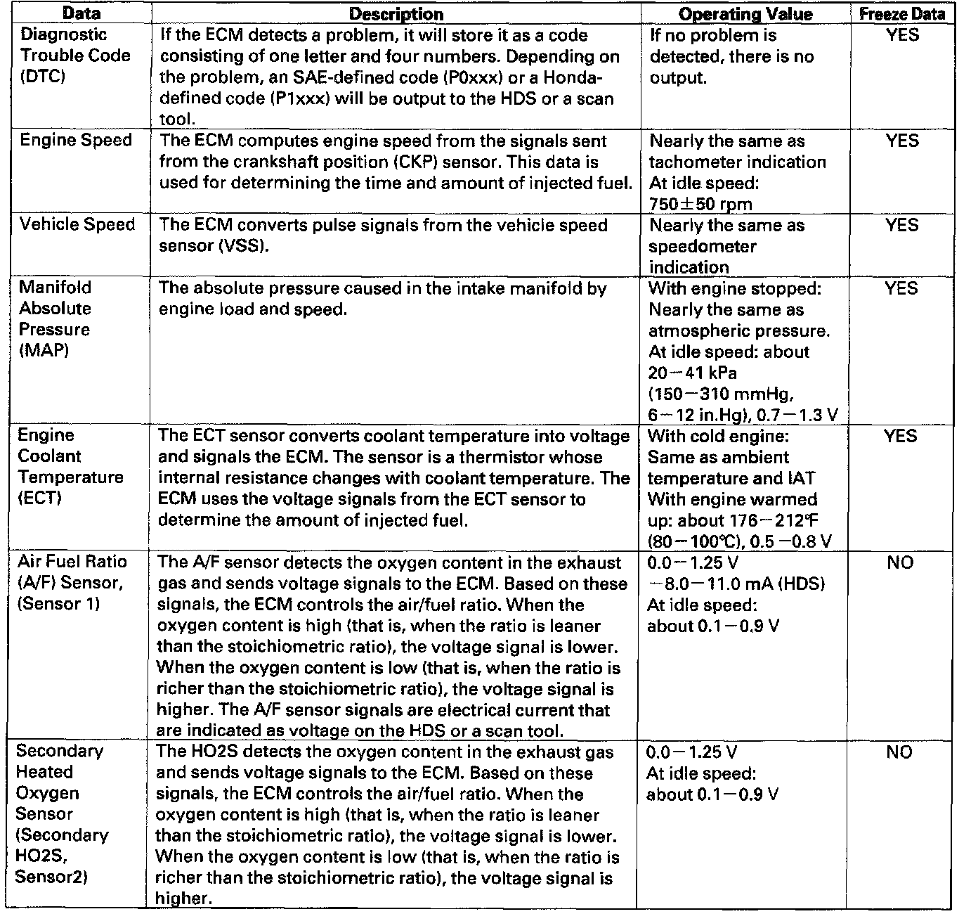 You can retrieve data from the ECM by connecting the HDS or a scan tool to the data link connector (DLC). The items listed in the table conform to SAE recommended practice. The HDS also reads data beyond that recommended by SAE to help you find the causes of intermittent problems.