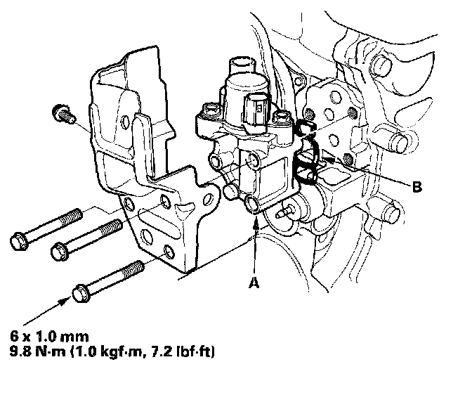 3. If the resistance is within specifications, remove the VTEC solenoid valve assembly (A) from the cylinder head, and check the VTEC solenoid valve filter (B) for clogging. If it is clogged, replace the solenoid valve filter, the engine oil filter, and the engine oil.