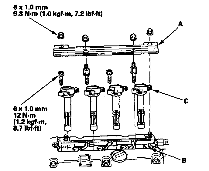 1. Remove the ignition coil cover (A), disconnect the ignition coil connectors (B), then remove the ignition coils (C).