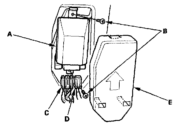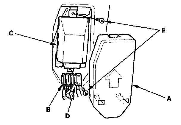 1. Place the new OPDS unit (A) on the seat-back frame. Tighten the two screws (B), and connect the OPDS unit 8P connector D and sensor connector (C) to the OPDS unit. Reinstall the cover (E).