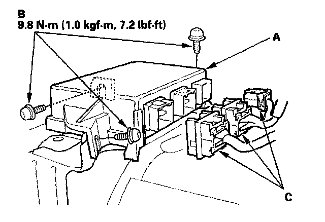 1. Install the new SRS unit (A) with Torx bolts (B), then connect the connectors (C) to the SRS unit; push them into position until they click.