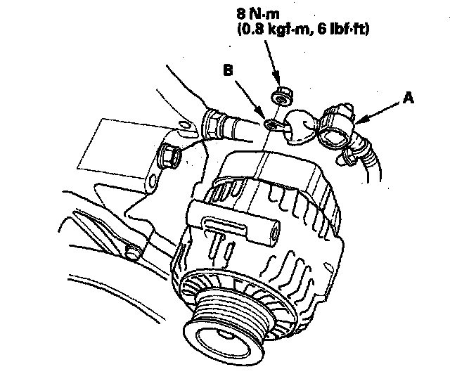 8. Disconnect the alternator connector (A) and BLK wire (B) from the alternator.