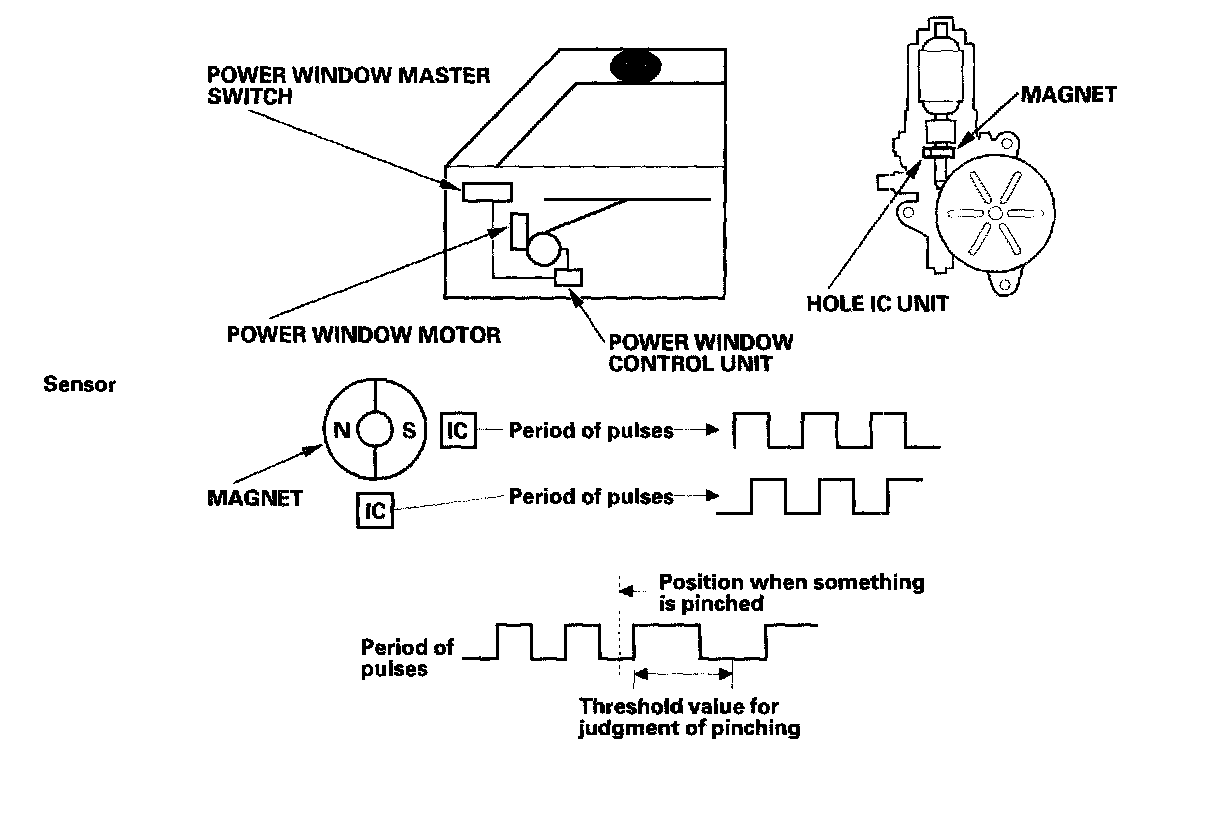 The driver's window will stop and automatically open if you pinch your hand or something during auto-up operation. The system is composed of the power window master switch, the power window control unit and the driver's window motor.
