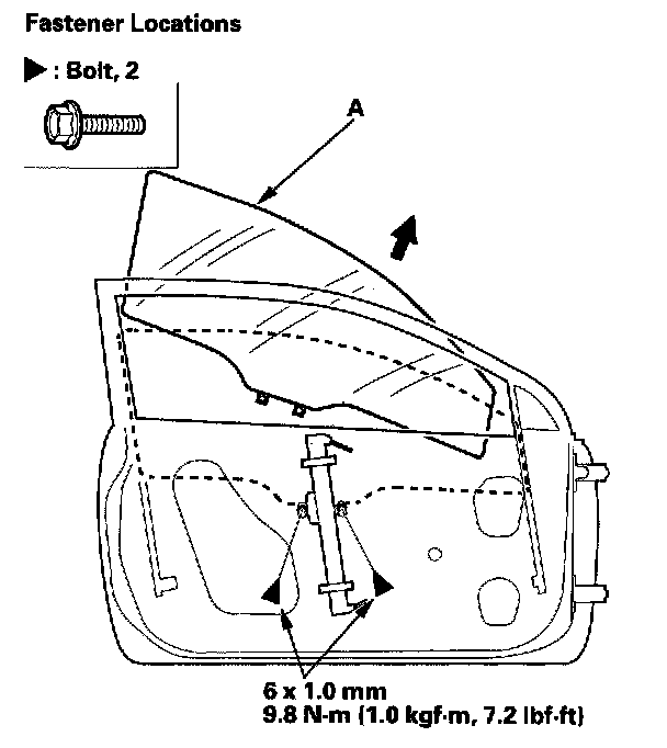 2. Carefully raise the glass (A) until you can see the bolts, then remove them. Carefully pull the glass out through the window slot. Take care not to drop the glass inside the door.