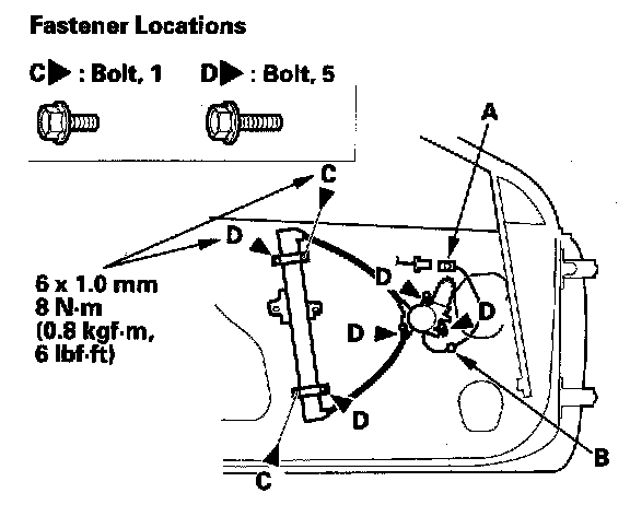 4. Remove the bolts (C), and loosen the bolts (D), then remove the regulator (E) through the hole in the door.