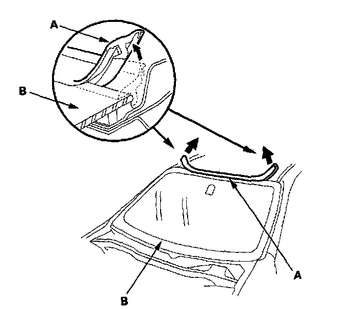 4. Remove the molding (A) from the upper edge of the windshield (B). If necessary, cut the molding with a utility knife.