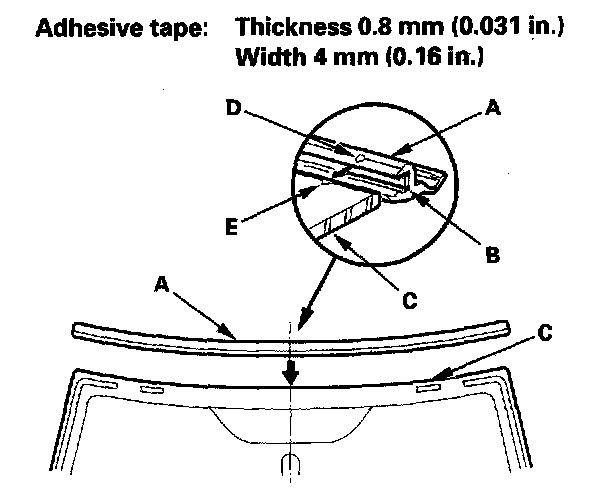14. Attach the molding (A) with adhesive tape (B) to the upper edge of the windshield (C):