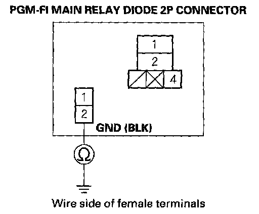 2. Check for continuity between body ground and PGM-FI main relay diode 2P connector terminal No. 2.