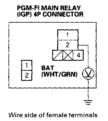 3. Measure voltage between body ground and PGM-FI main relay (IGP) 4P connector terminal No. 2.