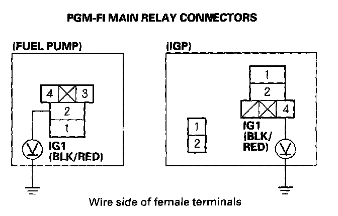 1. Turn the ignition switch OFF, then disconnect the PGM-FI main relay connectors.