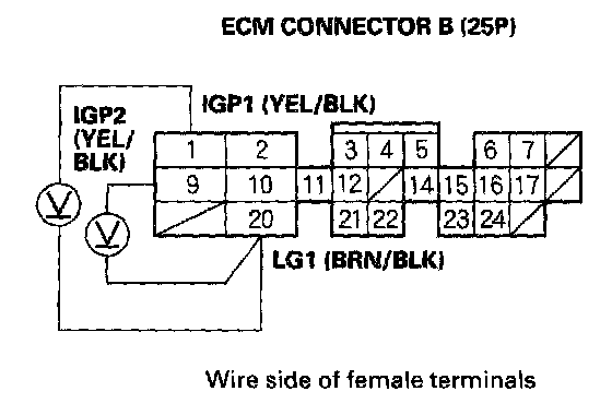 10. Turn the ignition switch ON (11), and measure voltage between ECM connector terminals B1 and B20, and between B9 and B20.
