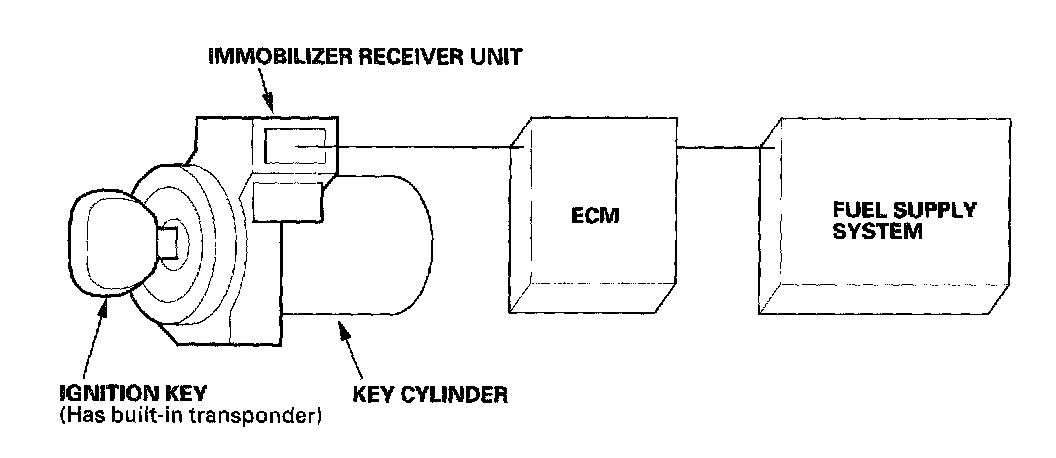 The vehicle is equipped with an immobilizer system that will disable the vehicle unless the proper ignition key is used. This system consists of a transponder located in the ignition key, an immobilizer receiver unit, an indicator light, and the ECM.