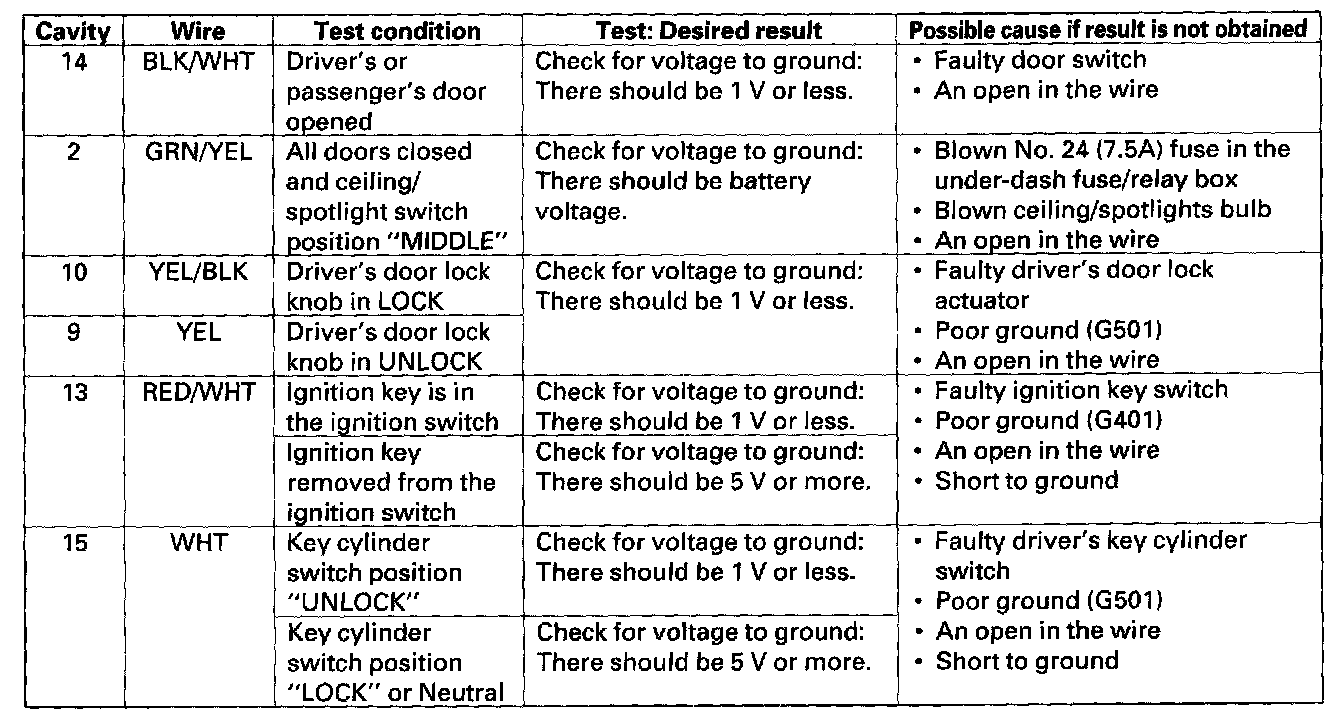 4. Reconnect the connector to the control unit, and perform the given input tests at the keyless door lock control unit connector.