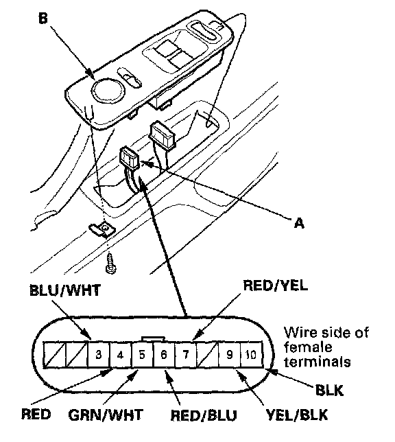 2. Disconnect the 10P connector (A) from the power mirror switch (B),and inspect the terminals. If the terminals are OK, go to step 3.