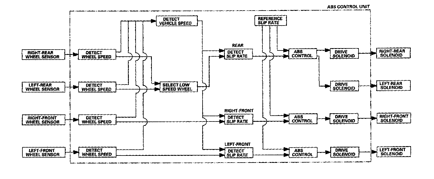 The ABS control unit calculates the slip rate of each wheel, and transmits the control signal to the modulator unit solenoid valve when the slip rate is high.