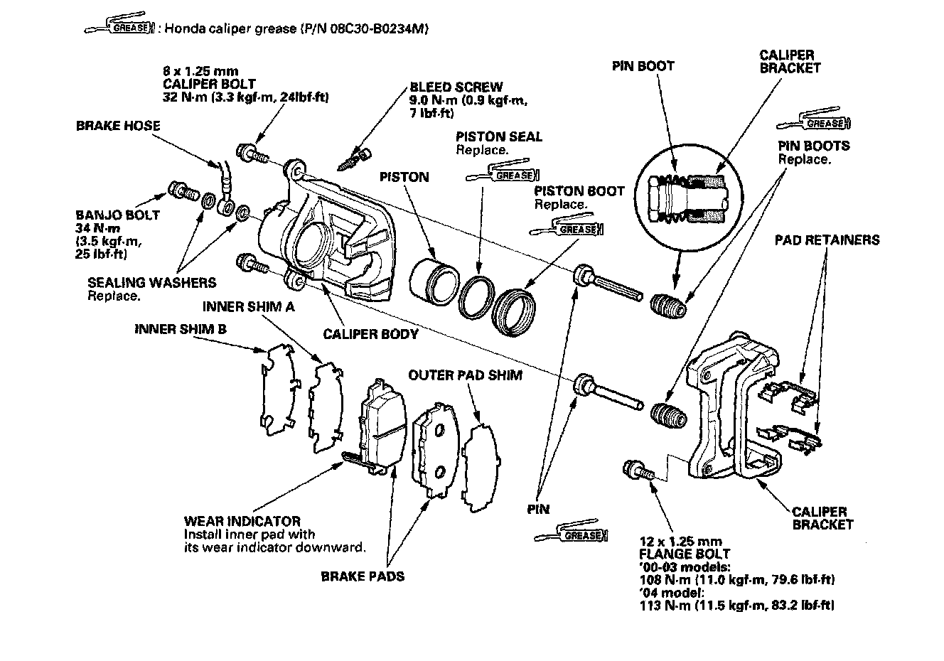 Front Brake Caliper OverhaulRemove, disassemble, inspect, reassemble, and install the caliper, and note these items: