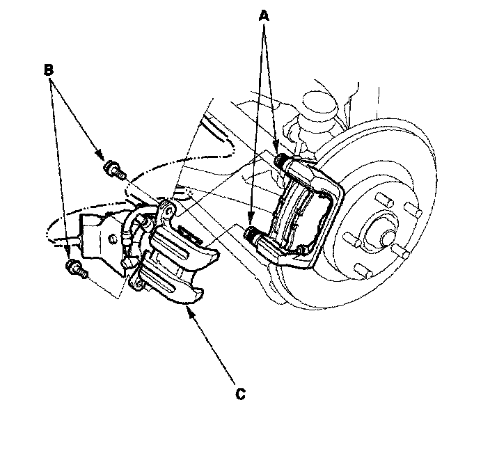 3. Hold the caliper pin (A) with a wrench, being careful not to damage the pin boot. Remove the two caliper bolts (B) with another wrench and caliper (C) from the bracket. Thoroughly clean the outside of the caliper to prevent dust and dirt from entering inside. Support the caliper with a piece of wire so it does not hang from the brake hose.