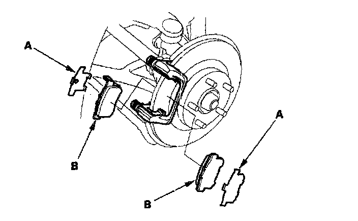 4. Remove the pad shims (A) and brake pads (B).