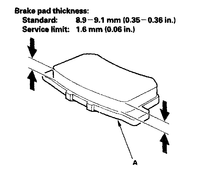 5. Using vernier calipers, measure the thickness of each brake pad lining. The measurement does not include the pad backing plate (A) thickness.