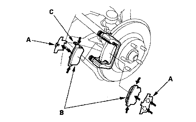 11. Install the brake pads (B) and pad shims on the caliper bracket. Install the inner pad with its wear indicator (C) facing upward.