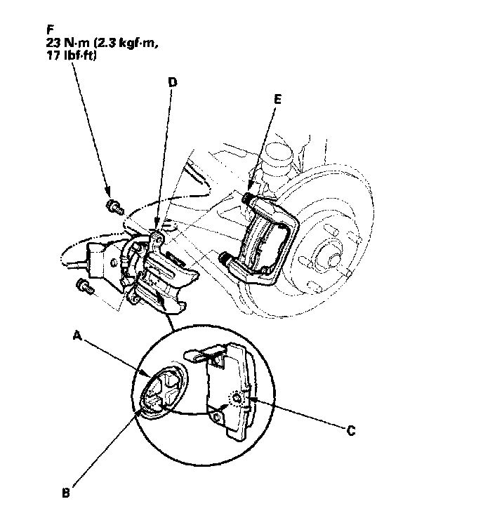 14. Hold the caliper pin (E) with a wrench, being careful not to damage the pin boot. Install the caliper bolts (F) with another wrench, and torque the caliper bolts to the proper specification.