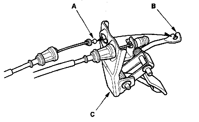 4. Disconnect the actuator cable end (A) from the arm (B) on the accelerator pedal assembly (C).