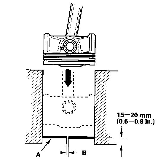Replacement1. Using a piston, push a new ring (A) into the cylinder bore 15 - 20 mm (0.6 - 0.8 inch) from the bottom.