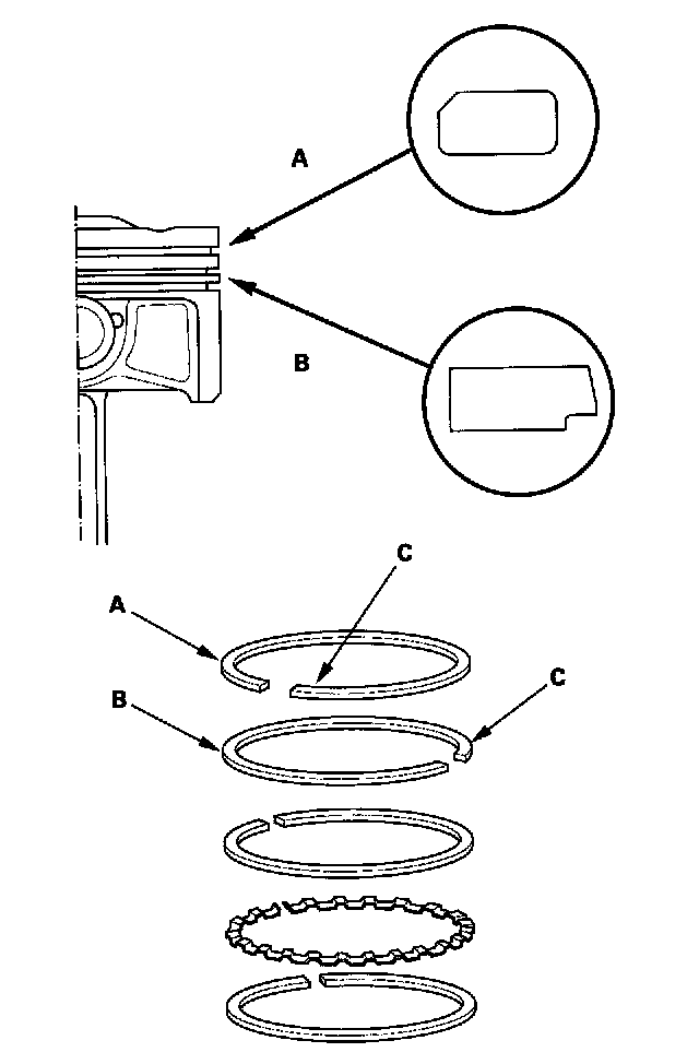 5. Install the rings as shown. The top ring (A) has a R1 mark and the second ring (B) has a R2 mark. The manufacturing marks (C) must be facing upward.