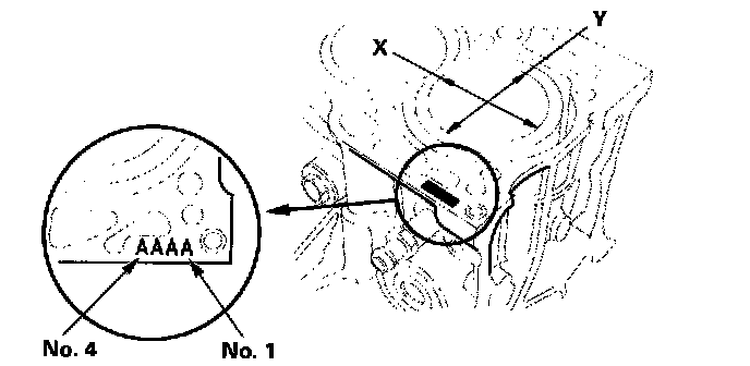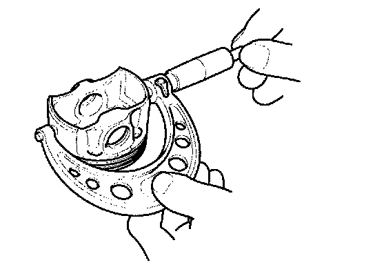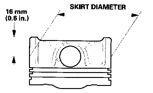 2. Measure the piston diameter at a point 16 mm (0.6 inch) from the bottom of the skirt. There are two standard-size pistons (No Letter or A, and B). The letter is stamped on the top of the piston. Letters are also stamped on the block as cylinder bore sizes.