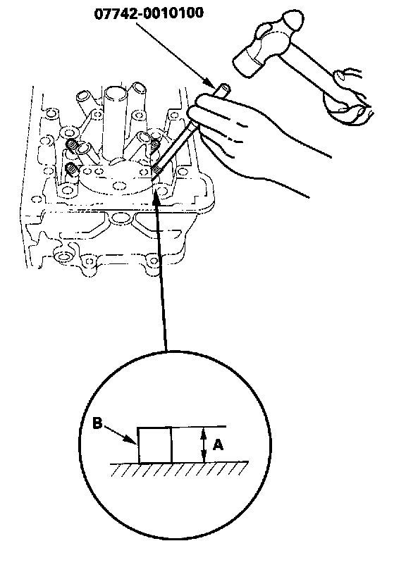 8. Apply a thin coat of clean engine oil to the outside of the new valve guide. Install the guide from the camshaft side of the head; use the special tool to drive the guide in to the specified installed height (A) of the guide (B). If you have all 16 guides to do, you may have to reheat the head.