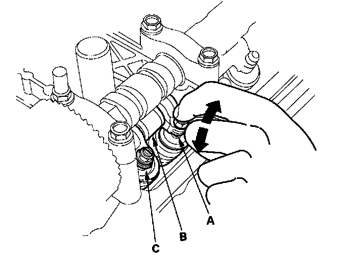 8. With the specified air pressure applied and the piston at TDC, move the secondary rocker arm (A). The mid rocker arm (B), primary rocker arm (C) and secondary rocker arm should move together. If the three rocker arms do not move together, replace the rocker arms as a set.