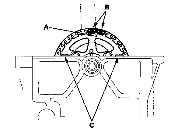28. Turn the idler gear counterclockwise to relieve cam chain free play, and check the alignment of the TDC marks (c) on the cam chain sprocket with the cylinder head surface. If the cam chain sprocket is not positioned at TDC, remove the idler gear from the cylinder head and reposition the cam chain to bring the cam chain sprocket to TDC.