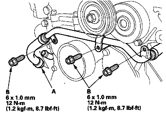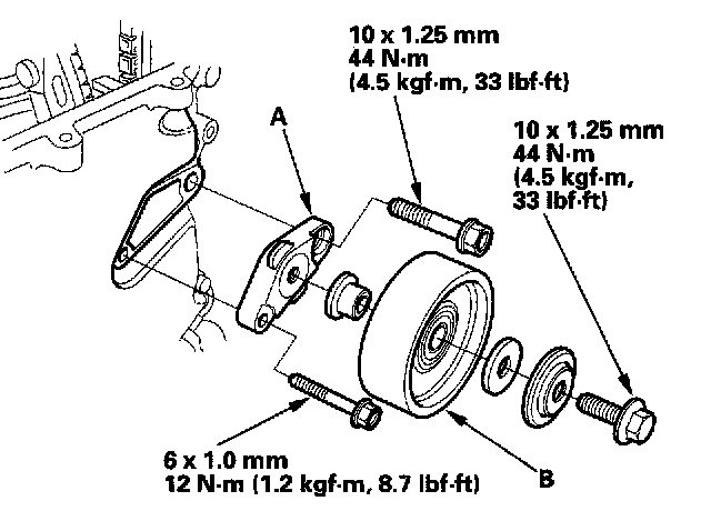 55. Install the idler pulley base (A), then install the idler pulley (B).