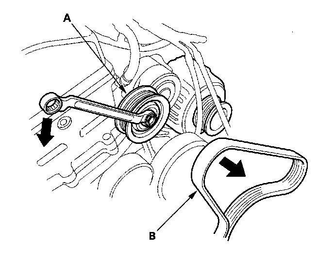 8. Move the auto-tensioner (A) to remove tension from the alternator-compressor belt (B), then remove the alternator-compressor belt.