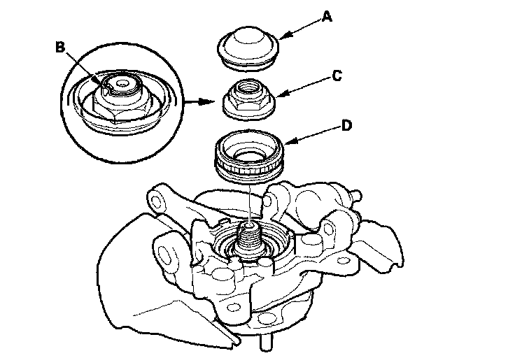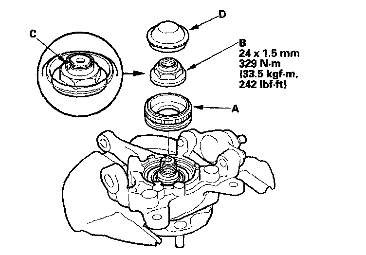 24. Press a new wheel bearing (A) into the knuckle (B) using the old bearing (C), a steel plate (D), the special tool, and a press. Place the wheel bearing on the knuckle with the pack seal side facing (E) (metal color) toward the inside. Be careful not to damage the sleeve of the pack seal.